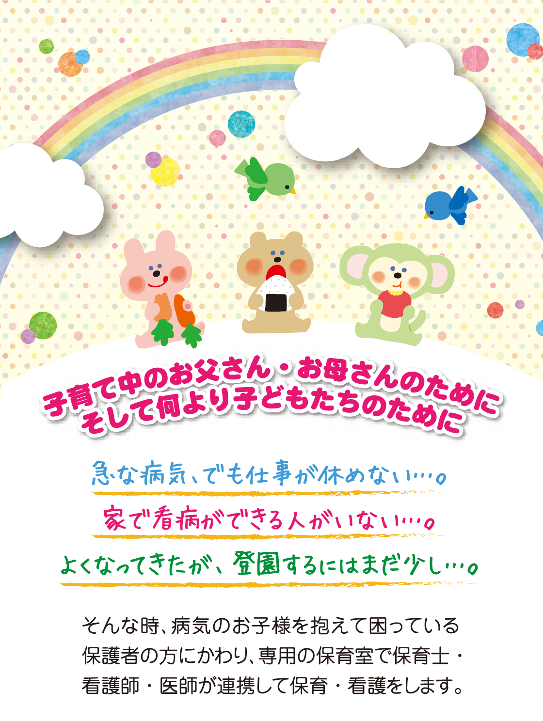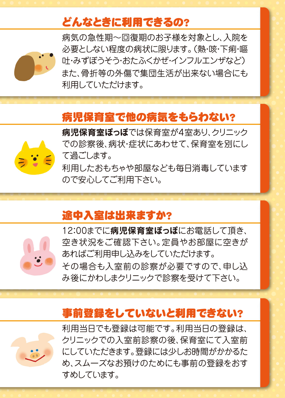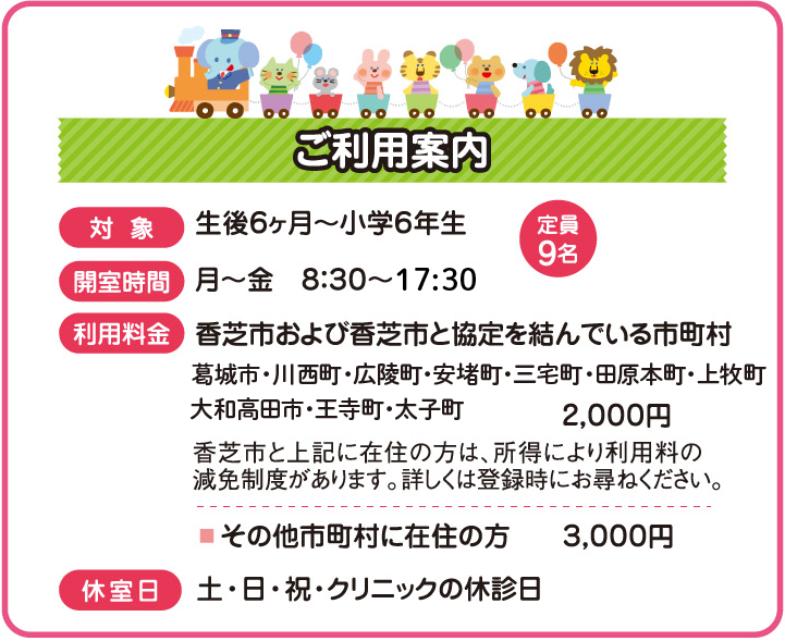 お子様の状態に合わせて着替え等多めにご持参下さい。